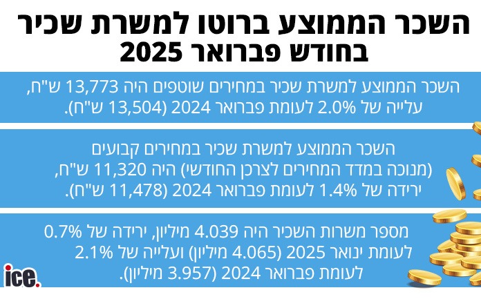 השכר הממוצע למשרת שכיר במחירים קבועים (מנוכה במדד המחירים לצרכן החודשי) היה 11,320 שקל, ירידה של 1.4% לעומת פברואר 2024 אז הסכום היה 11,478 שקל. מספר משרות השכיר היה 4.039 מיליון, ירידה של 0.7% לעומת ינואר 2025 (4.065 מיליון) ועלייה של 2.1% לעומת פברואר 2024 (3.957 מיליון).