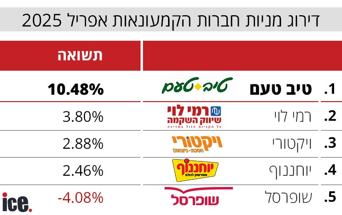 לפי דו"ח דירוג מניות הקמעונאות לחודש אפריל, הרשת שרשמה את העלייה החדה ביותר הייתה טיב טעם, עם תשואה חודשית של 10.48%. מיד אחריה דורגה רשת רמי לוי עם תשואה של 3.80% – שתיהן בלטו על רקע ביקושים גבוהים והסתערות של לקוחות לקראת החג.