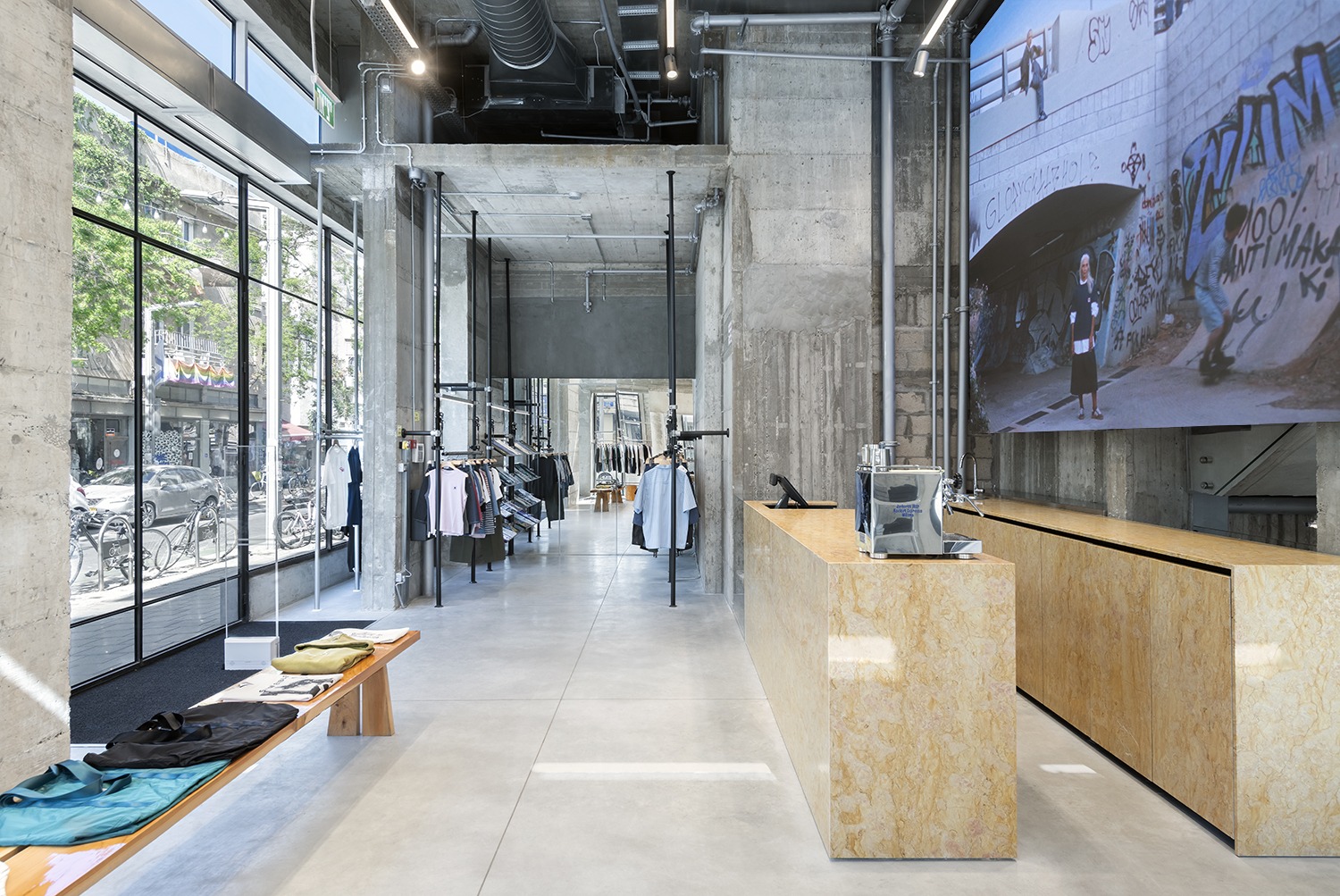 החנות משלבת חומרים תעשייתיים בדגש על בטון ופלדה (RAW) לצד עיצוב קמעונאי עכשווי. Andrea Caputo הוא אדריכל ומעצב בעל שם בינלאומי הידוע בעבודותיו בחנויות דגל של מותגים כמו Fucking Awesome, Alexander McQueen, Carhartt Wip ועוד. הוא מתמחה ביצירת חללים מסחריים ותרבותיים חדשניים המשלבים פונקציונליות אדריכלית לצד שילוב חומרים אקספרסיביים, גאומטריות שונות וקווים נקיים. החנות עוצבה במטרה לשקף את הרוח התל אביבית האופנתית.