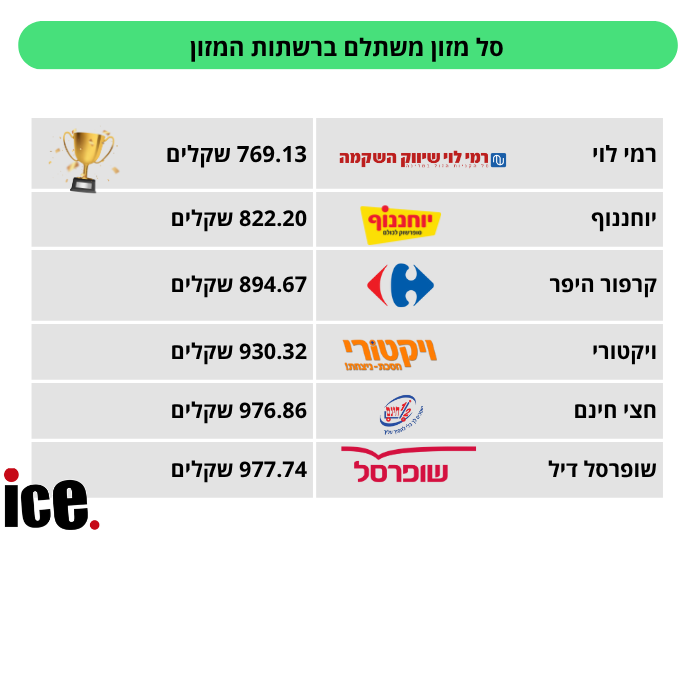מהבדיקה עולה כי רמי לוי מוביל את טבלת המחירים עם סל זול במיוחד שעמד על 769.13 שקלים, בעוד שהסל היקר ביותר הגיע ל-977.74 שקלים ברשת שופרסל דיל. פער של 209.61 שקלים או 27% מדובר בהבדל משמעותי שיכול להצטבר לאלפי שקלים בשנה עבור משפחה שעורכת קנייה שבועית קבועה.