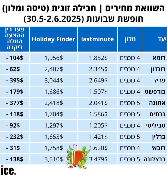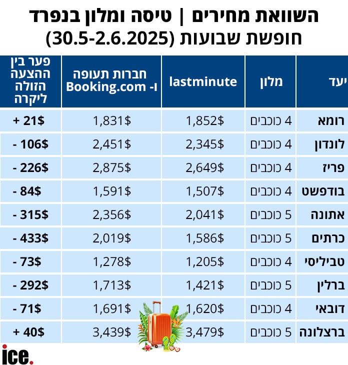 בדקנו עבורכם בכמה אתרים כמו בוקינג, לאס מינט והולידיי פיינדר. כמה מהיעדים הפופולריים לחג, והשווינו מחירים בין אתרים שונים לחבילות שכוללות טיסה ומלון. ההשוואה נעשתה על בסיס תאריכים אחידים, עם סוגי חדרים ומאפיינים זהים, כדי לתת תמונת מצב אמינה של השוק רגע לפני החג.