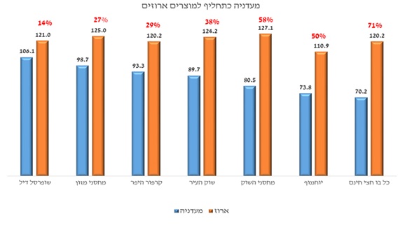 בירידה לרזולוציה של מוצר מעידה כי הפרש המדף – מעדניה הגבוה ביותר מצוי בגבינה בולגרית כאשר מוצר המדף יקר יותר בממוצע של כ-173% מאשר מוצר המעדנייה. פערים משמעותיים בין המוצר הארוז למוצר המעדנייה נמצאו גם בגבינת שמנת נפוליאון (61%), כדור מוצרלה ומוצרלה בייבי של גד (49% ו- 38% בהתאמה) וצהובה של עמק (29%). ההפרש הנמוך ביותר נמצא במוצרלה קשה ועומד על כ-6%.