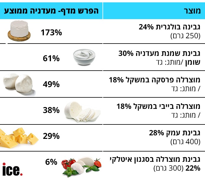 הפער המשמעותי ביותר נמצא בגבינה הבולגרית של פיראוס: המוצר הארוז יקר בממוצע בכ-173% לעומת אותו מוצר במעדנייה.פערים גדולים נמצאו גם בגבינת שמנת נפוליאון (61%), כדורי מוצרלה ומוצרלה בייבי של גד (49% ו-38%), וגם בגבינה הצהובה של עמק (29%) הפער הקטן ביותר – רק 6% – נמצא במוצרלה קשה.
