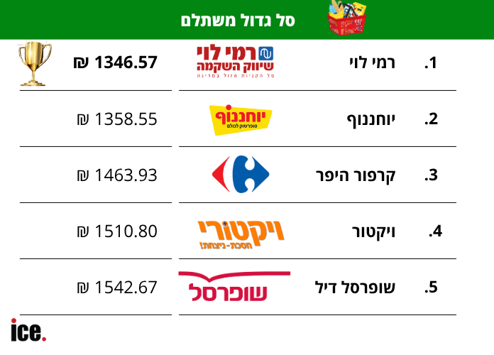 בדקנו בעזרת אתר פרייסז את מחירי סל הקניות ברשתות המזון השונות, כשהסל כלל מוצרי בשר, ירקות ופירות, מוצרי מזון יבשים, חומרי ניקיון ומוצרי צריכה שוטפת נוספים. מדובר בסל קנייה גדול יחסית, כזה שמאפיין קנייה שבועית למשפחה ממוצעת בישראל אחרי תקופה של חגים, בילויים והוצאות.