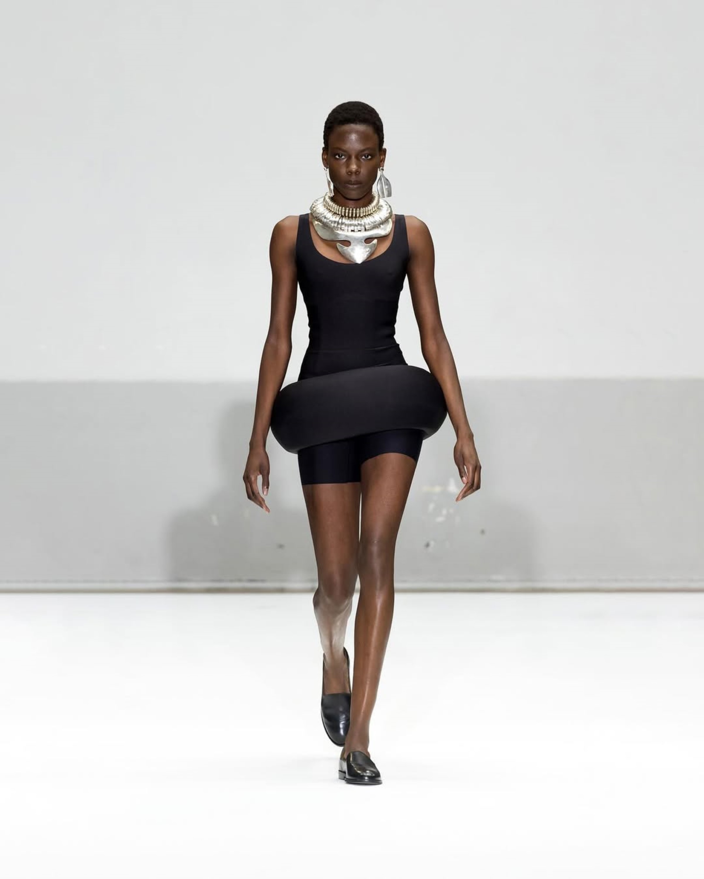 אחד הדגמים המדוברים – חזיית סיליקון בצורת שדיים תפוחים – הפך לוויראלי ברשת והבהיר: מדובר במעצב שלא מפחד לשאול שאלות קשות על גוף, פרופורציה, ומשיכה. עיצוב נוסף – שמלת מסך ששידרה בזמן אמת את הקהל עצמו – סימן את המפגש בין אופנה, אמנות וטכנולוגיה.
