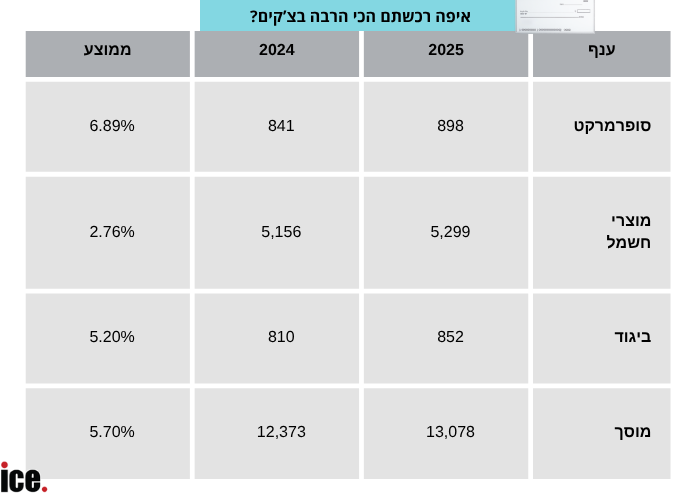 הדו"ח, שמבוסס על ניתוח עסקאות שבוצעו בצ’קים, מתייחס לכלל ענפי הצריכה ומצביע על עלייה ממוצעת של 5.43% בעסקאות. כלומר, גם בתחומים שאינם מזון – העלייה מורגשת. בענף מוצרי התינוקות נרשמה העלייה החדה ביותר – 12.36%. גם ענפי הביגוד (5.2%), המוסכים (5.7%) ומוצרי החשמל (2.76%) רשמו עליות. אפילו בבתי המרקחת, שם הרכישות לרוב הכרחיות ומבוקרות יותר, נרשמה עלייה של 5.43%.