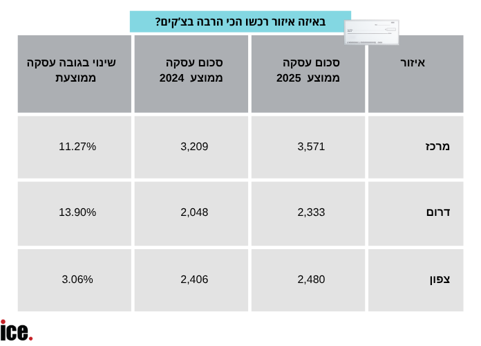 נתוני מנורה ERN מצביעים גם על פערים אזוריים משמעותיים. המרכז מוביל עם גובה עסקה ממוצעת של 3,571 שקלים – עלייה של 11.27% לעומת מאי 2024. בדרום נרשמה דווקא העלייה החדה ביותר – 13.9% – אך הסכום הממוצע בעסקאות עומד שם על 2,333 שקלים בלבד. בצפון, שם העסקים טרם חזרו לשגרה בעקבות הלחימה, העלייה צנועה יחסית – 3.6% בלבד – עם גובה עסקה ממוצעת של 2,480 שקלים.