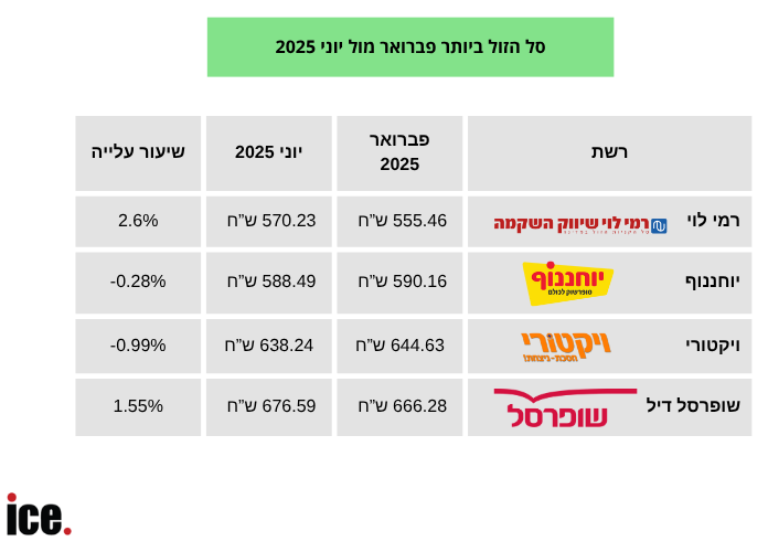 מנגד, רשתות כמו יוחננוף וויקטורי הצליחו לייצר בחודש יוני סל זול יותר מהחודשים הקודמים. אך הרשת היחידה שהמשיכה לייקר את סל הקניות באופן עקבי היא שופרסל דיל – עם עלייה של כ-10 שקלים בסל החודשי, פער שנשמר לעומת רמי לוי. בפברואר הפער בין הסלים עמד על 111 שקלים (כ-20%), וביוני עדיין נשמר פער של 106 שקלים (כ-18%).