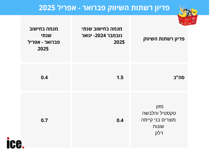 על פי הדו"ח, בתקופה זו נרשמה עלייה של 0.4% בסך הפדיון של רשתות השיווק, בהאטה לעומת עלייה של 1.5% בשלושת החודשים הקודמים (נובמבר 2024–ינואר 2025). בתחום רשתות המזון נרשמה עלייה של 0.7% בפדיון, לעומת עלייה מתונה יותר של 0.4% בשלושת החודשים הקודמים.