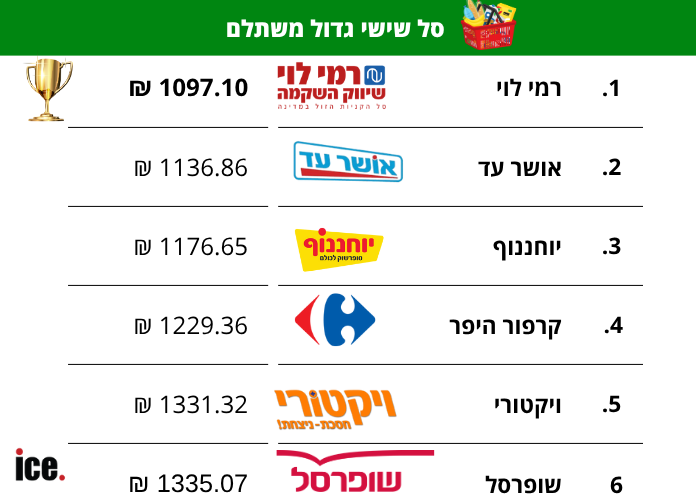 על פי הנתונים, הסל הזול ביותר נמצא ברשת רמי לוי, עם עלות כוללת של 1,097.10 שקל, ואילו הסל היקר ביותר נמצא ברשת שופרסל דיל, בעלות כוללת של 1,335.07 שקל. הפער בין הסלים עומד על 237.97 שקל, שהם 21.7% יותר – עבור אותם מוצרים ובאותן כמויות.