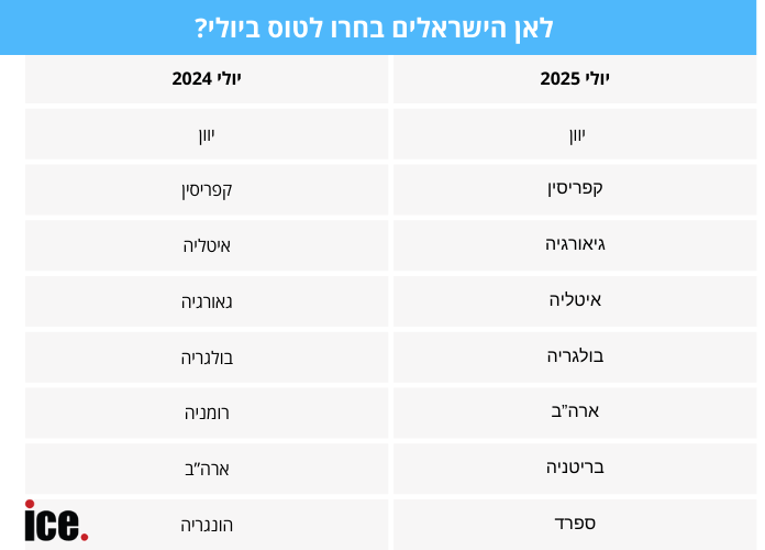 מהנתונים עולה כי גם השנה יוון ממשיכה להוביל בפער את רשימת היעדים המועדפים על הקהל הישראלי, כשקפריסין שומרת על המקום השני. גאורגיה מזנקת מהמקום הרביעי בשנה שעברה למקום השלישי, בעוד שאיטליה נחלשת מעט ויורדת למקום הרביעי.