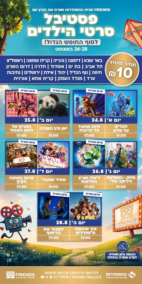 מדובר בפסטיבל סרטי הילדים לסוף החופש הגדול של רשת FRIENDS מבית ההסתדרות. במשך שבוע לקראת סוף החודש הגדול (24-28.8) ב-20 אולמות מצפון ועד דרום, יוקרנו סרטי הילדים הכי חדשים שיש, בדיבוב לעברית במחיר אחיד ושווה לכולם של 10 ש"ח לכרטיס בלבד.