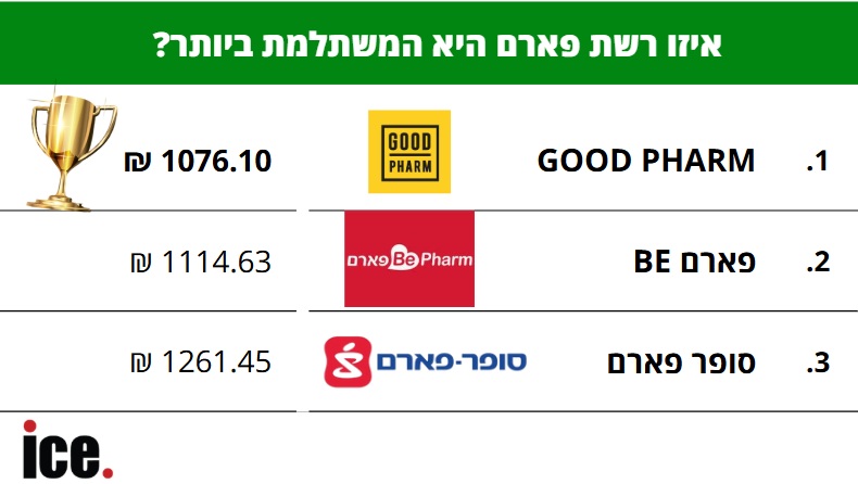 מתוצאות הבדיקה עולה כי רשת גוד פארם, שבבעלות איש העסקים רמי לוי ובשיתוף אדם פרידלר ואוהד סנדלר, הציעה את סל הקנייה הזול ביותר – 1,076.10 ש"ח.