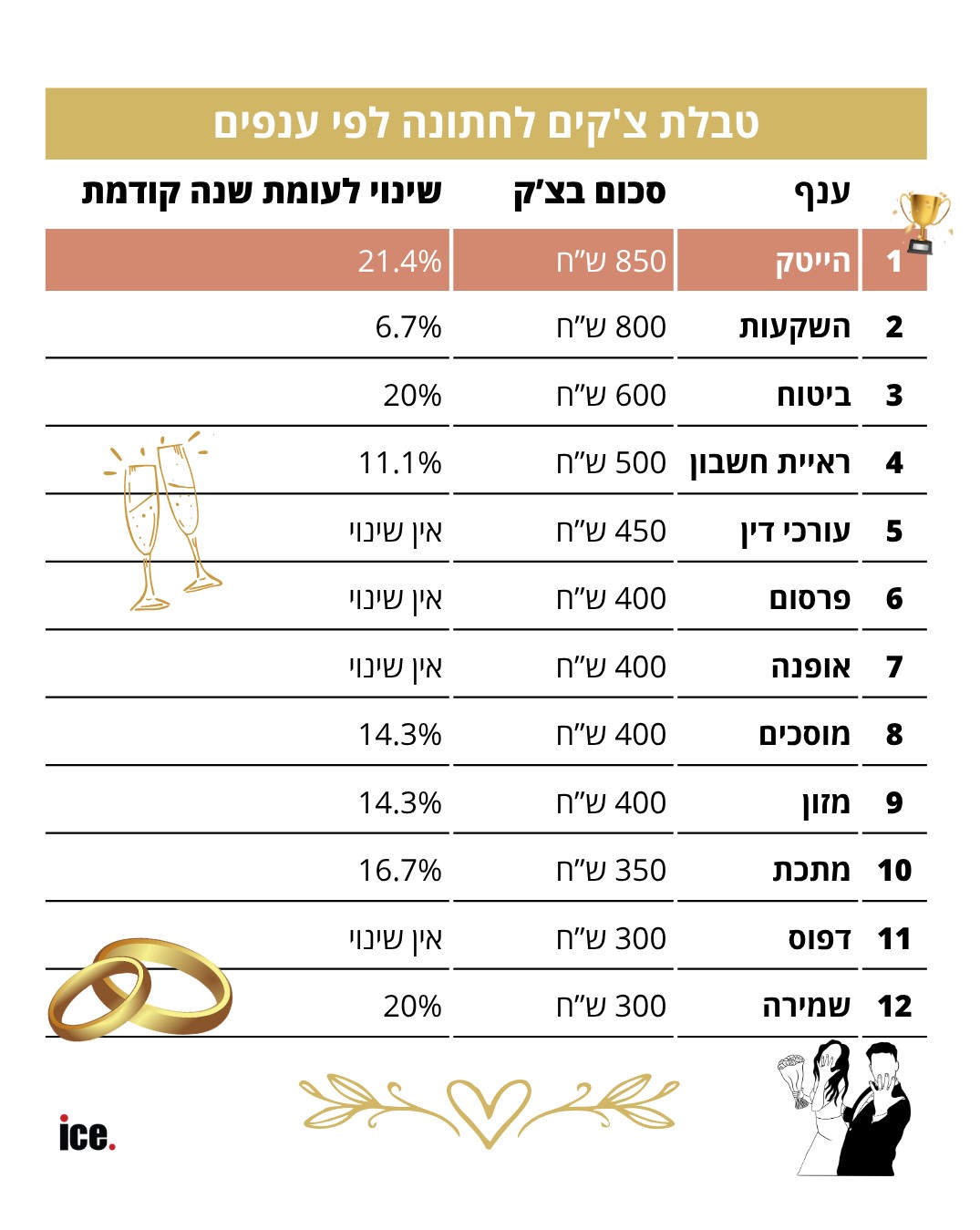 גובה ההמחאה שניתנת לעובדים לרגל נישואיהם עלה באופן ניכר לעומת השנה שעברה. אבל לא בכל הענפים חילקו יותר. אז איפה הגדילו את הסכום, מי נשאר מאחור, ובאיזה תחום רשום על הצ'ק המספר הכי גבוה? כל הנתונים בפנים