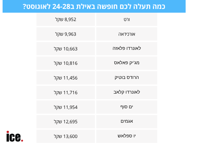 בדקנו והשווינו כמה תעלה חופשה "מהיום להיום" באוגוסט, ומצאנו חופשה זולה יחסית במלון ורט במחיר של 8,952 ש"ח, לעומת החופשה היקרה ביותר שמצאנו באותם תאריכים – במלון רויאל ביץ' של רשת ישרוטל – בעלות של 18,946 ש"ח.