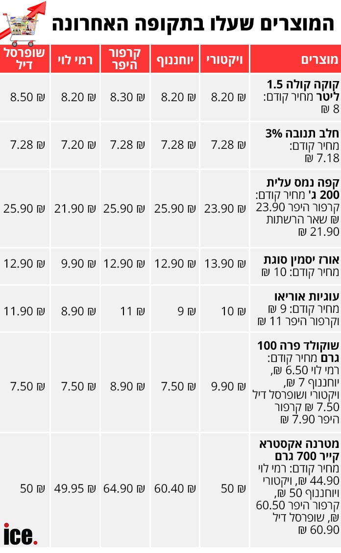 ברשת ויקטורי, המוצר נמכר ב־50 שקלים ונשאר באותו מחיר. לעומת זאת, ברשת יוחננוף, המחיר עלה מ־50 שקלים ל־60 שקלים, עלייה של 20%.