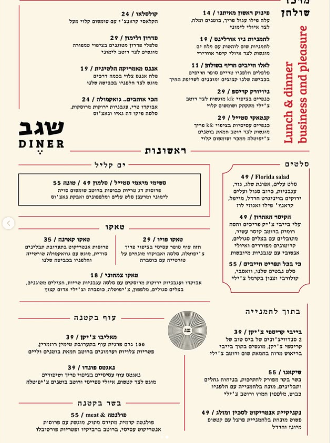 המנות בדיינר מצולמות נהדר, נגישות לקהל הרחב - ממשפחות ועד זוגות בדייט - וכוללות סטייקים טריים בפחות מ־100 שקלים, המבורגרים מבשר מיושן ב־60 שקלים ומנות פתיחה מוקפדות, שזו הבשורה של הדיינר: אוכל טוב במחיר הגון.
