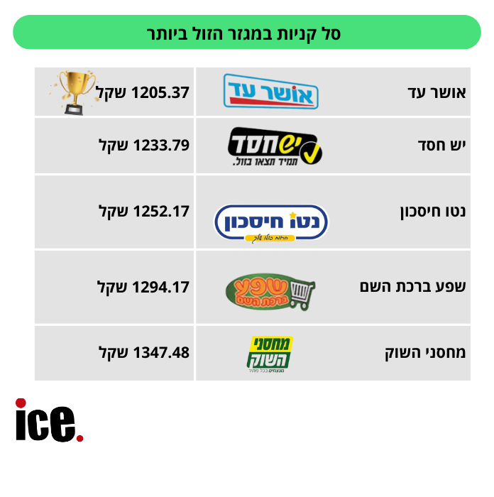 הסל היקר ביותר בסקר נמצא ברשת "מחסני השוק למהדרין", עם עלות כוללת של 1,347.48 שקלים. מדובר בפער של כ-142 שקלים לסל זהה, מה שמעיד על פוטנציאל חיסכון משמעותי למשפחות, במיוחד בעיתות של יוקר מחיה גובר.