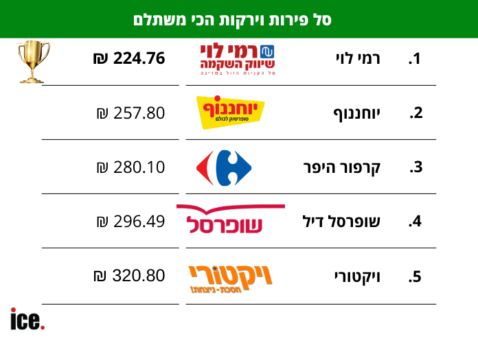 בדיקה שערכנו באמצעות אתר פרייסז מצאה פערים מהותיים בין רשתות השיווק השונות, כאשר רשת רמי לוי נמצאה כזו המציעה את סל הפירות והירקות הזול ביותר 224.76 שקלים. לעומת זאת, רשת ויקטורי התברגה במקום האחרון עם סל יקר משמעותית שעלה 320.80 שקלים.