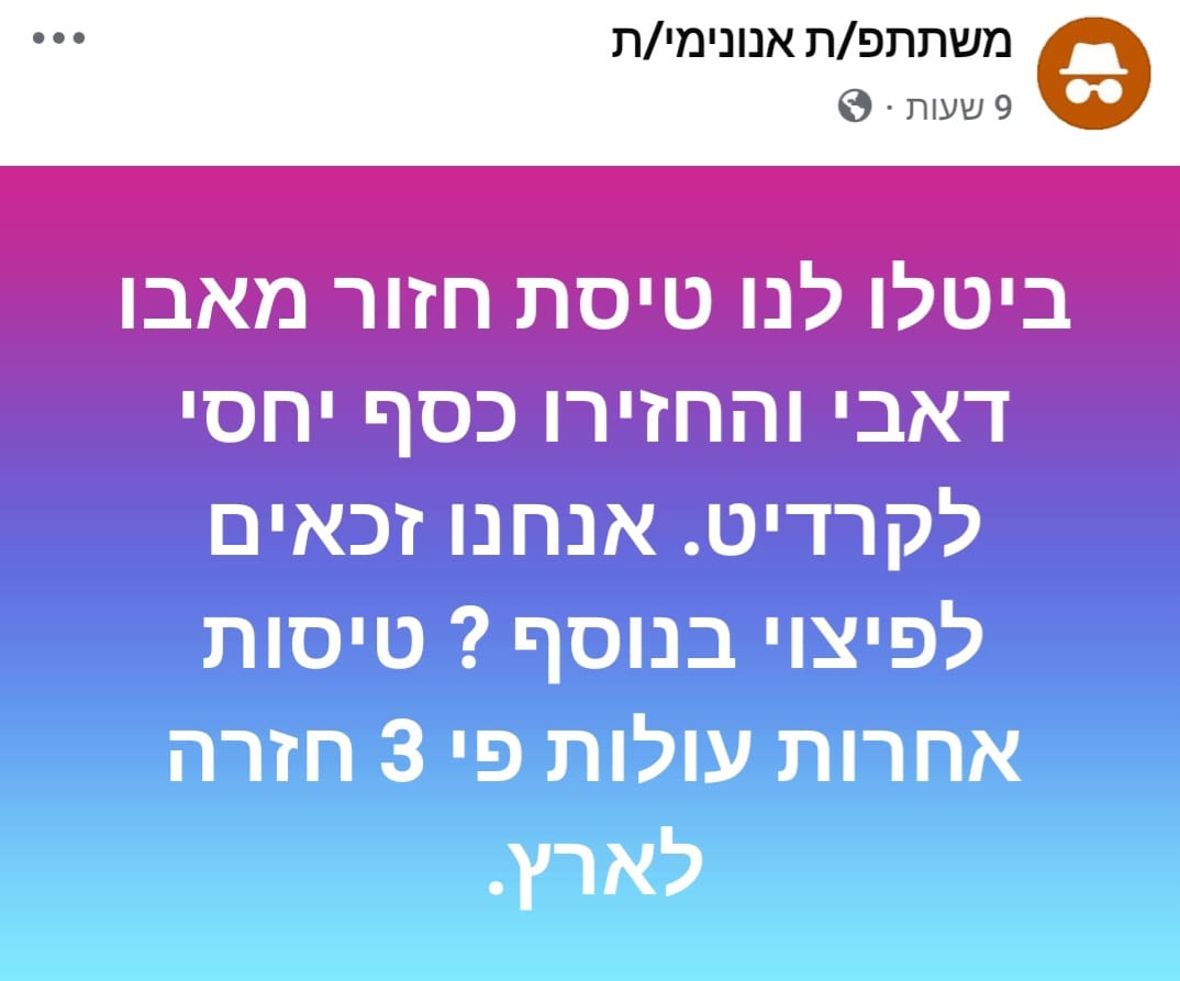 5.אנחנו כבר קנינו כרטיסים וכעת בלי כרטיס והכסף הלךדליה 08/2025/24הגב לתגובה זו1 1ומי יעזור לנו לחזור הביתה עכשיו? מצטערת שקניתי מהם כרטיסים שכם הטיסה היתה על הפניםסגור