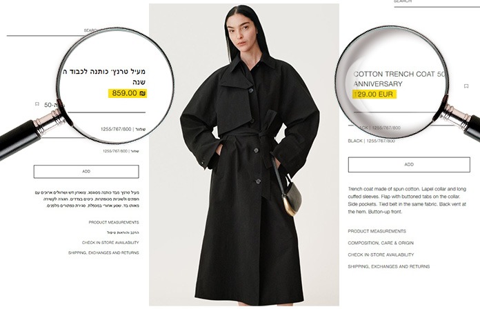 מעיל טרנץ' שזמין בישראל ב־859 שקלים עולה בספרד 129 יורו, שהם כ־502 שקלים בלבד. מדובר בפער של יותר מ-71%.