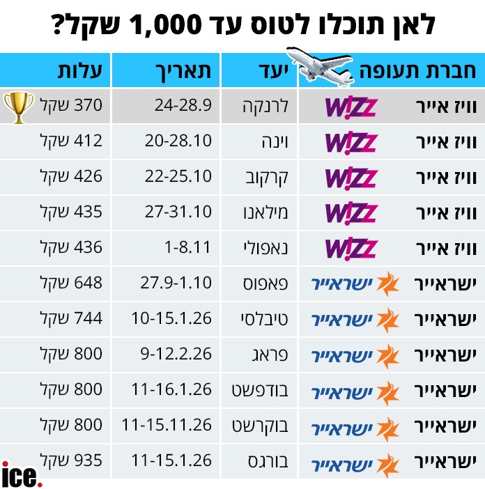 מצאנו טיסה זולה ללרנקה בעלות של 370 שקל (110 דולר בלבד). עוד טיסה מעניינת היא לנאפולי בעלות של 436 שקל - שווה ערך ל-130 דולר. שתי הטיסות הן עם חברת התעופה וויז אייר שנמצאת בימים אלו במוקד העניינים עקב ההתקדמות לבניית בסיס תעופה ראשון בארץ.