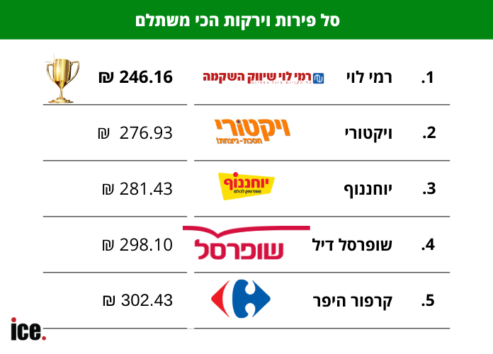 על פי נתוני ההשוואה, רשת רמי לוי מציעה את סל הפירות והירקות הזול ביותר, בעלות כוללת של 246.16 שקל. מנגד, רשת קרפור היפר היא היקרה ביותר, עם סל זהה שעלה 302.43 שקל.