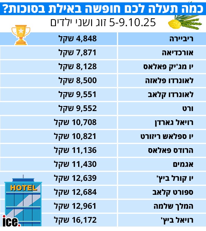 משפחות רבות סגרו חופשה לראש השנה, אחרות כבר מחפשות אחר חופשה לחג סוכות - משום שהמחירים יקפצו סמוך לחג. היעד האידאלי הוא אילת, בו עדיין חם ונעים. לשם כך, בדקנו כמה תעלה חופשה משפחתית לזוג הורים ושני ילדים? התוצאות לפניכם