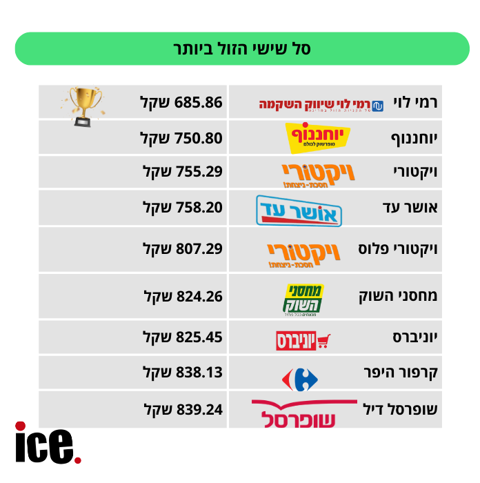 התוצאה: רשת רמי לוי היא הזולה ביותר עם סל בגובה 685.86 שקלים. לעומת זאת, הסל היקר ביותר נמצא ברשת שופרסל דיל, שם אותו סל בדיוק יעלה 839.24 שקלים. מדובר בפער של 153.38 שקלים, שהם כ־22.4% יותר עבור אותם פריטים.