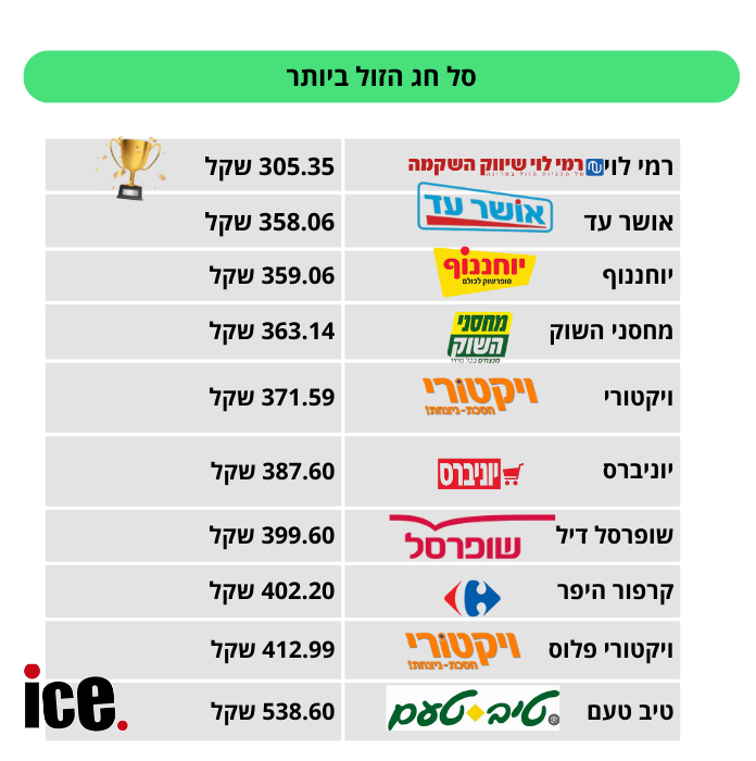 מהבדיקה עולה כי רשת רמי לוי היא הזולה ביותר, עם סל שעלה 305.35 שקל. את הסל היקר ביותר מצאנו ברשת טיב טעם, שם אותו סל בדיוק עלה 538.60 שקל. הפער בין שתי הרשתות עומד על 233.25 שקל, שהם כ-76%.