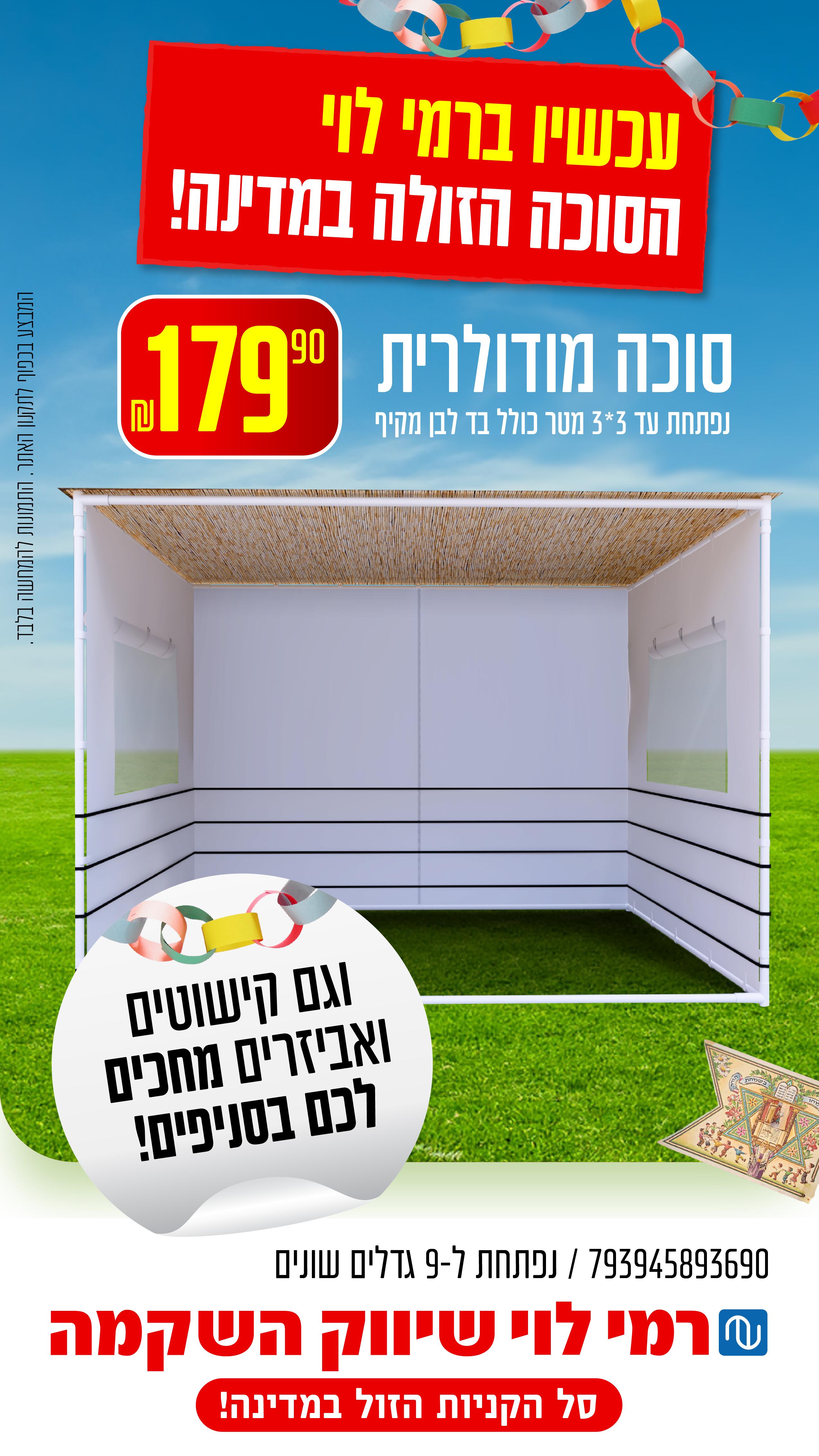 קניתם כבר סוכה לחג? אם אתם חושבים שכזו תעלה לכם כ-300 שקלים, ברשת רמי לוי שיווק השקמה אתגרו לאחרונה את השוק עם הצעה חדשה לסוכה מודולרית רק ב־199.90 שקל. אבל היום (ראשון) היא מורידה אפילו את המחיר עוד יותר לכדי מחיר הנמוך בכחצי משאר הרשתות המתחרות.