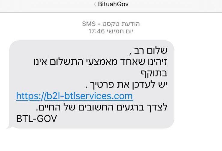 בהודעה שנשלחה כמסרון לטלפונים של לא מעט ישראלים נכתב: ''שלום רב, זיהינו שאחד מאמצעי התשלום אינו בתוקף. יש לעדכן את פרטיך''. כאן נוסף קישור לאתר המתחזה לביטוח לאומי ונכתב: ''לצדך ברגעים החשובים של החיים''.
