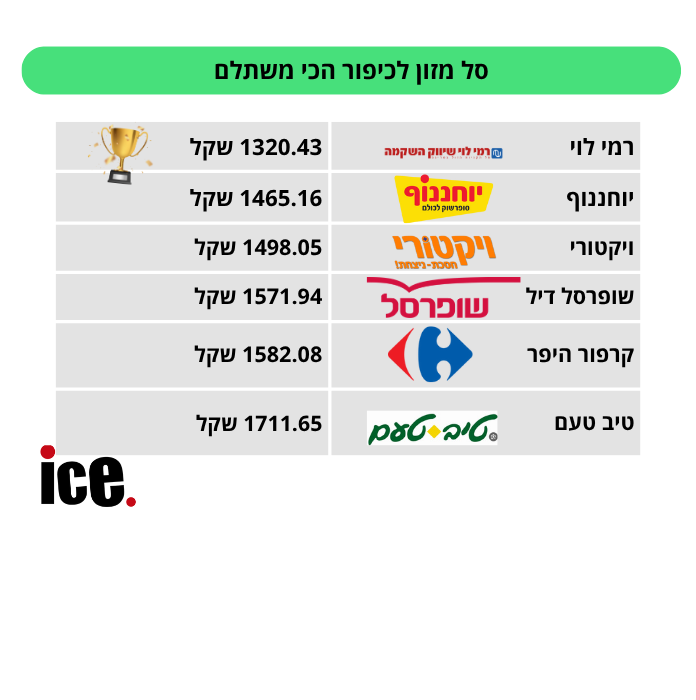 הסל הזול ביותר נמצא ברשת רמי לוי, עם עלות כוללת של 1320.43 ש"ח, בעוד הסל היקר ביותר היה בטיב טעם, עם עלות של 1711.65 ש"ח.