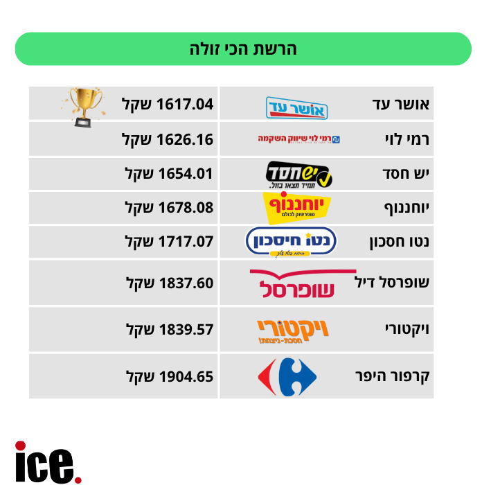 מהבדיקה עולה כי סל הקניות הזול ביותר ניתן היה למצוא ברשת "אושר עד", עם עלות כוללת של 1,617.04 שקל. לעומת זאת, אותו סל בדיוק ברשת "קרפור היפר" הגיע ל-1,904.65 שקל. המשמעות: פער של 287.61 שקל בין הקצה הזול לקצה היקר סכום שלא מעט צרכנים היו מעדיפים שיישאר אצלם בכיס.