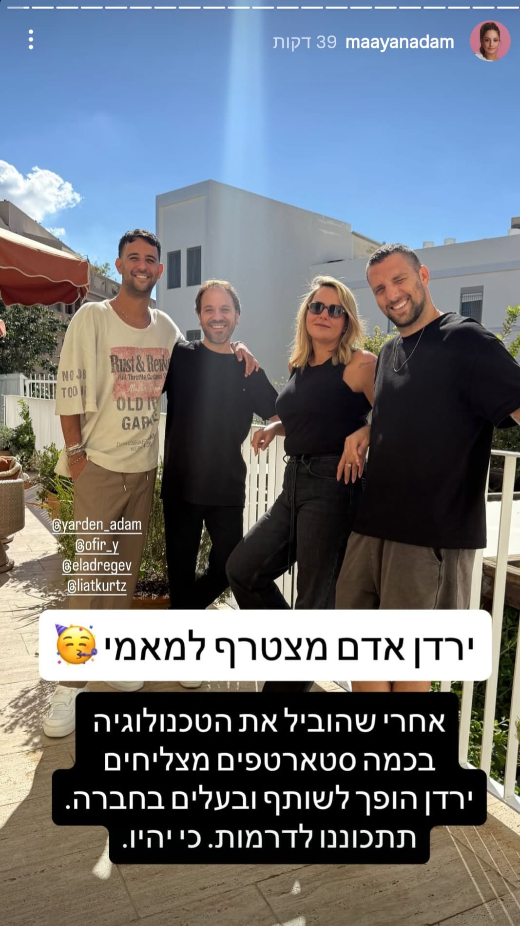 מעיין שיתפה את הבשורה בסטורי שלה וכתבה: "אחרי שהוביל את הטכנולוגיה בכמה סטארטאפים מצליחים, ירדן הופך לשותף ובעלים בחברה. תתכוננו לדרמות, כי יהיו".