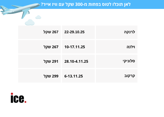 בדקנו לאן תוכלו לטוס בפחות מ-300 שקל ואם זה בכלל עוד אפשרי. אז אם תהיתם כן, זה אמיתי. בחודשים אוקטובר ונובמבר, ניתן למצוא טיסות הלוך־חזור בפחות מ-300 שקל ליעדים כמו סלוניקי, קרקוב, לרנקה ווילנה. כמובן, מדובר בתאריכים נבחרים ויציאות באמצע השבוע, אבל למי שגמיש זו הזדמנות אמיתית לקפוץ לחו"ל במחיר של ארוחת ערב.