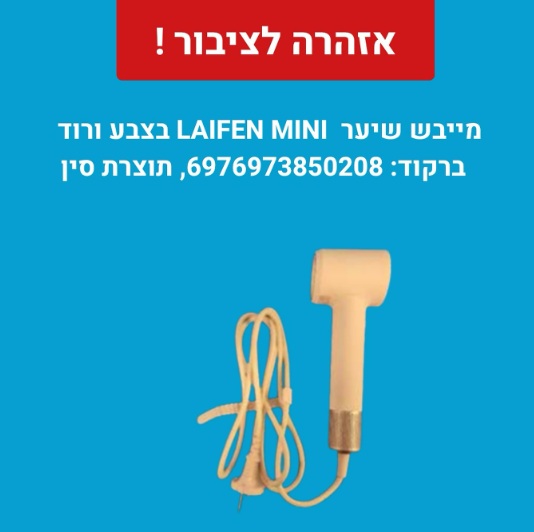 הממונה על התקינה במשרד הכלכלה והתעשייה הודיע כי חברת ביקונקט טכנולוגיות בע״מ קוראת לציבור להפסיק באופן מידי את השימוש ב־17 יחידות של מייבש השיער LAIFEN MINI בצבע ורוד. המוצר, שיובא מסין והחל להימכר בישראל בחודש ינואר 2025, שווק בטעות ללא מתאם לכבל החשמל, דבר שעלול להפוך אותו למסוכן לשימוש.