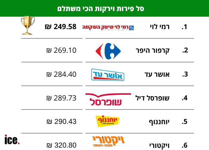 התוצאות מפתיעות. הבדיקה גילתה כי הסל הזול ביותר נמצא ברשת רמי לוי, בעלות כוללת של 249.58 שקל, בעוד הסל היקר ביותר נמצא ברשת ויקטורי, שם העלות הגיעה ל-320.80 שקל.