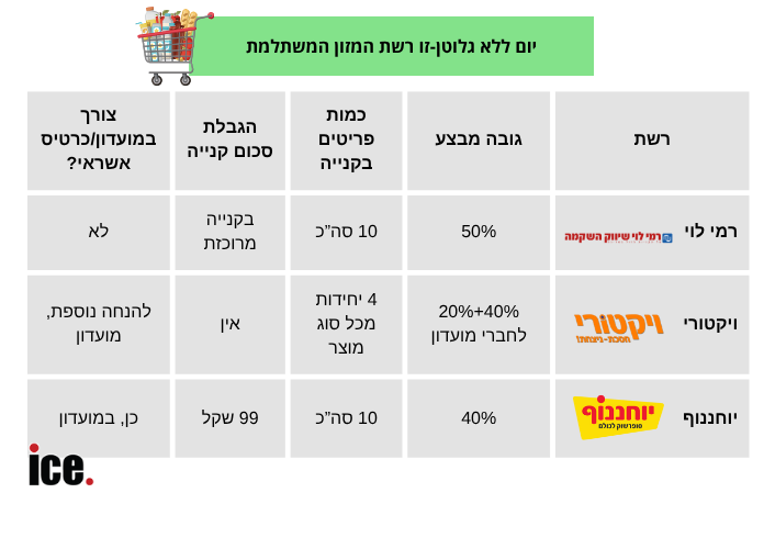 הרשת שמציעה את ההנחות הגבוהות ביום זה עם כמות פריטים גבוהה ובלי מועדון וכדומה,, היא רשת רמי לוי שמציעה 50% על מגוון מוצרים ללא גלוטן, מוגבל ל-10 פריטים בקנייה אחת רחבה. ללא צורך במועדון או כרטיס אשראי.