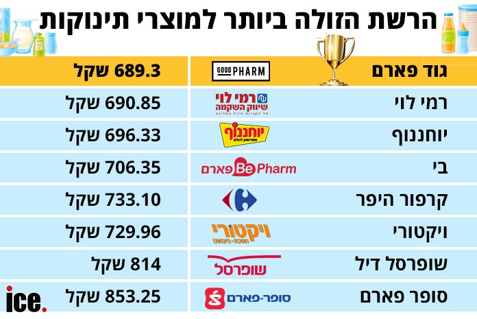 ההשוואה כללה מוצרים בסיסיים כמו טיטולים, תחליפי חלב, גרברים, מגבונים ומוצרי תינוקות נוספים. מהבדיקה עולה כי הסל הזול ביותר נמצא ברשת גוד פארם בבעלות רמי לוי, עם עלות של 689.30 שקל לסל. בצמוד אליה נמצאת הרשת של רמי לוי עצמה עם סל בעלות של 690.85 שקל, יותר בשקל וחצי בלבד.