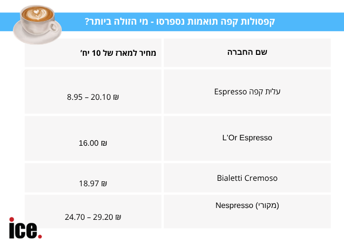מותג ל’אור (L’Or), שנחשב מהנפוצים והמוערכים בקרב הקפסולות התואמות, נמכר כיום בכ-16 שקלים למארז של עשר יחידות. הטעם חזק והקפסולות מתאימות כמעט לכל מכונה של נספרסו. מותג אחר, עלית קפה אספרסו, משווק קפסולות במחירים הנעים סביב תשעה עד עשרים שקלים, תלוי ברשת ובמבצע. זהו אחד הפתרונות המשתלמים ביותר לצרכן המקומי, במיוחד כאשר יש מבצע של שניים במחיר אחד או הנחה במועדון לקוחות.