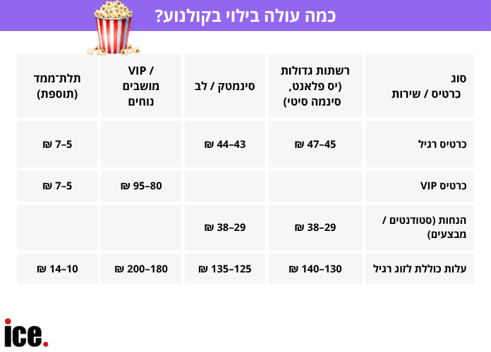 מי שמעדיף חוויה יוקרתית יותר, עם מושבים נוחים ותפריט מוגש למקום – ישלם הרבה יותר. כרטיס ל־VIP נע בין 80 ל־95 שקל, ולעיתים כולל שתייה או חטיף קטן. הקרנות תלת־ממד מוסיפות עוד 5–7 שקלים לכרטיס, כך שמשפחה בת ארבע נפשות עלולה לשלם מעל 200 שקל רק על הכרטיסים.
