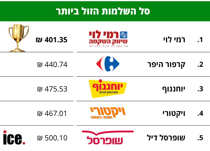 מהבדיקה עולה כי הסל הזול ביותר נמצא ברשת רמי לוי שיווק השקמה, עם עלות כוללת של 401.35 שקל. לעומתו, הסל היקר ביותר נמצא ברשת שופרסל דיל, שם אותו סל בדיוק עלה 500.10 שקל. מדובר בפער של 98.75 שקל, שהם כ-24.6% על אותם מוצרים בדיוק.
