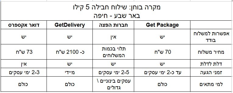 כדי להבין את התמונה, בדקנו משלוח פשוט של חבילה במשקל חמישה קילוגרמים מבאר שבע לחיפה מקרה מבחן שממחיש את הפערים בין השירותים.