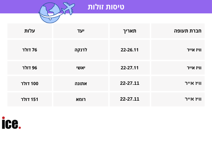 בדיקה שביצענו בסקייסקנר העלתה מספר יעדים מפתיעים במחירים אטרקטיביים. חלק מהטיסות שמצאנו עולות כ־250 שקל בלבד הלוך וחזור לאדם, בעוד אחרות נעות בטווח של עד 500 שקל. בין היעדים הבולטים נמצאות רומא, עיר שמציעה שילוב של היסטוריה עשירה ואווירת חג נוצצת, יאשי שברומניה שהפכה לאחת המפתיעות של השנים האחרונות עם שוקי כריסטמס צבעוניים במיוחד, ולרנקה בקפריסין שמציעה חופשה קצרה וזולה עם מזג אוויר נעים והכנות לחג ברחבי העיר.