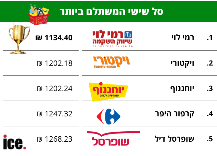 כדי להבין היכן משתלם לקנות את סל השישי, בדקנו מחירים באמצעות אתר פרייסז והשווינו סל מוצרים זהה בין רשתות המזון המובילות. הנתונים מראים פער ברור: רמי לוי מציעה את הסל הזול ביותר, שמסתכם ב־1,134 שקלים, בעוד שבשופרסל דיל אותו סל בדיוק עולה 1,268.24 שקלים. המשמעות היא שהקנייה בשופרסל דיל עולה למשפחה 134.24 שקלים יותר פער של כמעט 12%.