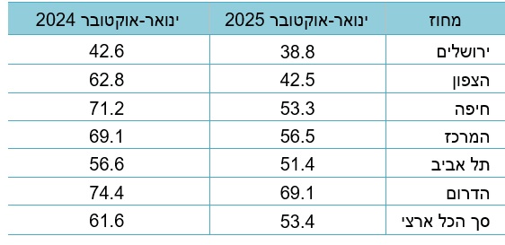 תפוסת החדרים הממוצעת עמדה על 53% בלבד, ירידה מהותית לעומת 62% בינואר–אוקוטבר 2024. הפילוח האזורי חושף פערים משמעותיים: במחוז ירושלים נרשמה התפוסה הנמוכה ביותר (39%), ואילו במחוז הדרום, הגבוהה ביותר (69%).