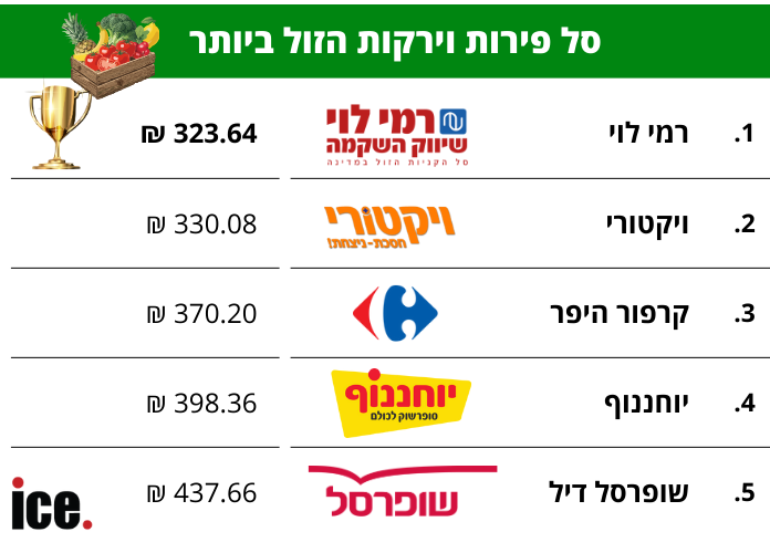 השבוע בדקנו והשווינו באמצעות אתר פרייסז את מחירי סל הפירות והירקות ברשתות השונות, והתוצאות חד־משמעיות. רמי לוי מציג את הסל הזול ביותר, שמסתכם ב־323.64 שקלים. מיד אחריו, באופן מפתיע במיוחד, ניצבת רשת ויקטורי עם סל כמעט זהה במחיר של 330.08 שקלים בלבד.