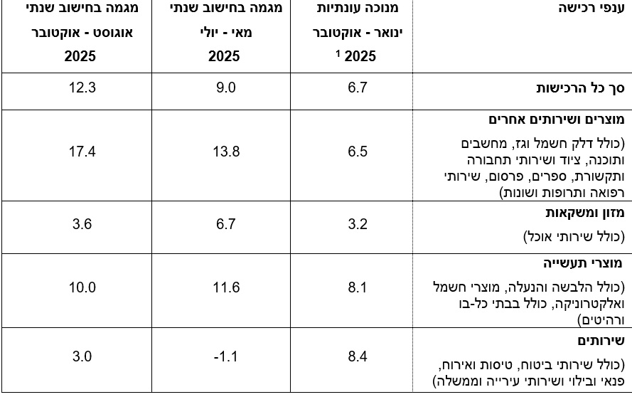 גם קבוצת מוצרי התעשייה רשמה עלייה ברורה של 10%, כאשר רכישות של לבוש והנעלה עלו יותר מהכול, ואחריהן רכישות של רהיטים ומוצרי חשמל. בתחום המזון והמשקאות, הכולל גם מסעדות ושירותי אוכל, נרשמה עלייה מתונה יותר של 3.6%, אך עדיין מורגשת בתקופה שבה ארוחות מחוץ לבית והכנות לחגים מגבירות את ההוצאות.