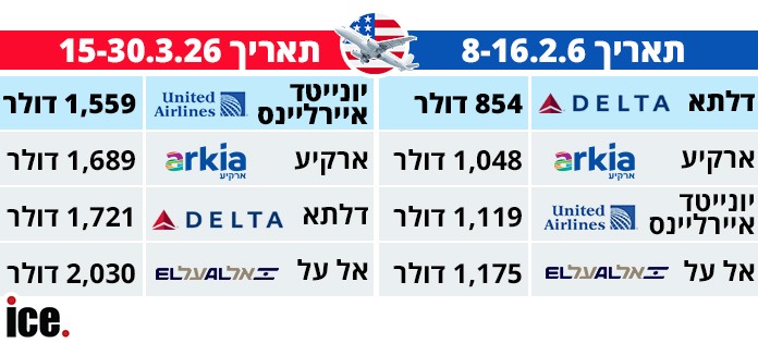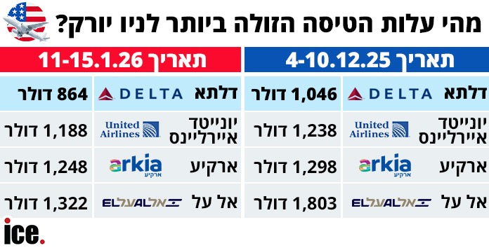 ההשוואה בוצעה בין ארבע חברות תעופה שמציעות טיסות ישירות לניו יורק: דלתא, יונייטד איירליינס, אל על וארקיע. בנוסף, ברבעון השני של השנה צפויה להצטרף לתחרות המחירים גם ישראייר, מה שעשוי להרחיב את אפשרויות הבחירה ולהשפיע על המחירים.